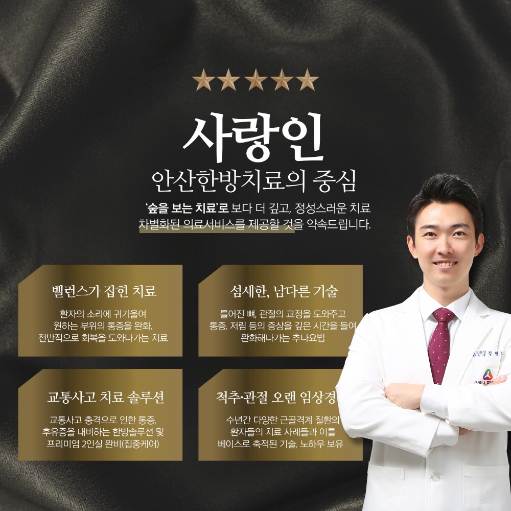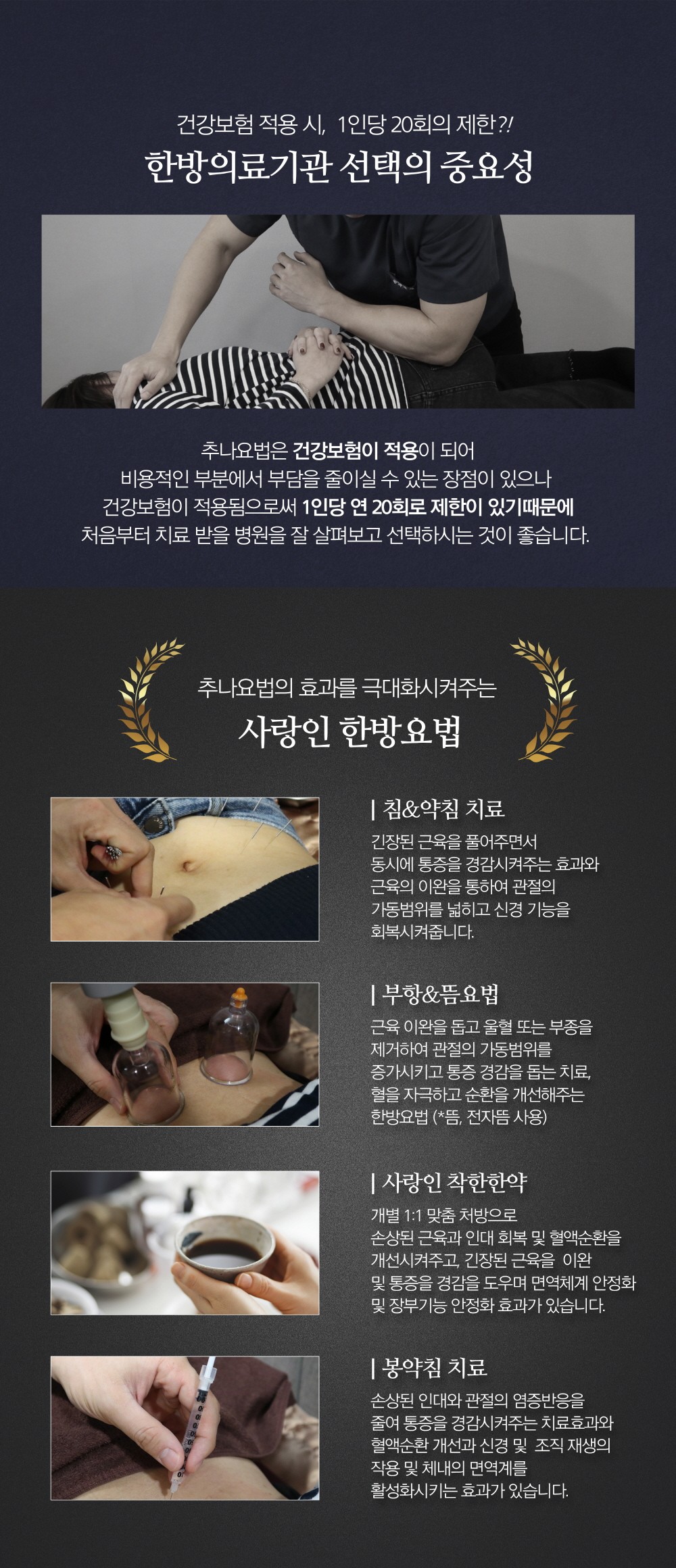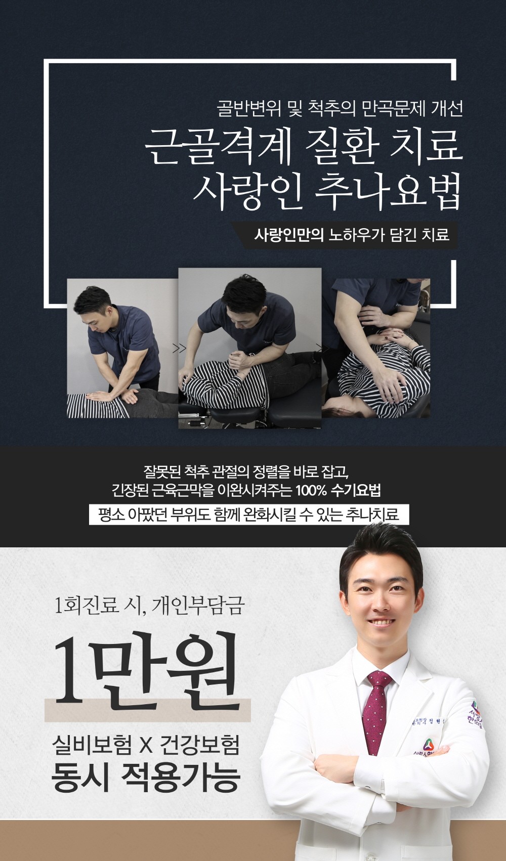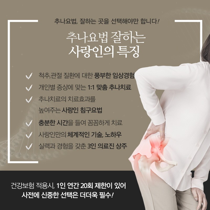 오로지 의료진이 손과 신체 일부를 이용하여 진행하기 때문에 실력이 중요합니다. 척추, 관절 등 해부학적 구조에 대한 풍부한 지식과 임상경험이 중요합니다. 개인 증상과 통증에 따라 추나요법이 가능한 곳을 선택하시길바랍니다. 안산사랑인한의원에서는 충분한 시간을 들여 꼼꼼하게 치료하며 체계적인 기술과 노하우로 통증완화에 도움드리고있습니다.