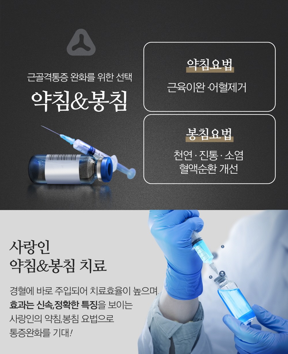 관절염이나 디스크질환을 겪고 있는 분이라면 안산고잔동물리치료와 추나요법을 통해 개선가능합니다. 물리치료는 발생부위에 맞는 치료법을 활용하여 조직 치유를 촉진하고 통증을 완화하여 신체 움직임을 향상하는데 도움을 드립니다. 이 외에도 약침치료는 근육을 이완하고 어혈제거에 효과적입니다. 봉침치료는 천연, 진통, 소염 등에 효과가 있습니다. 경혈에 직접 투여되기 때문에 치료효과가 빠르다는 장점이 있습니다.
