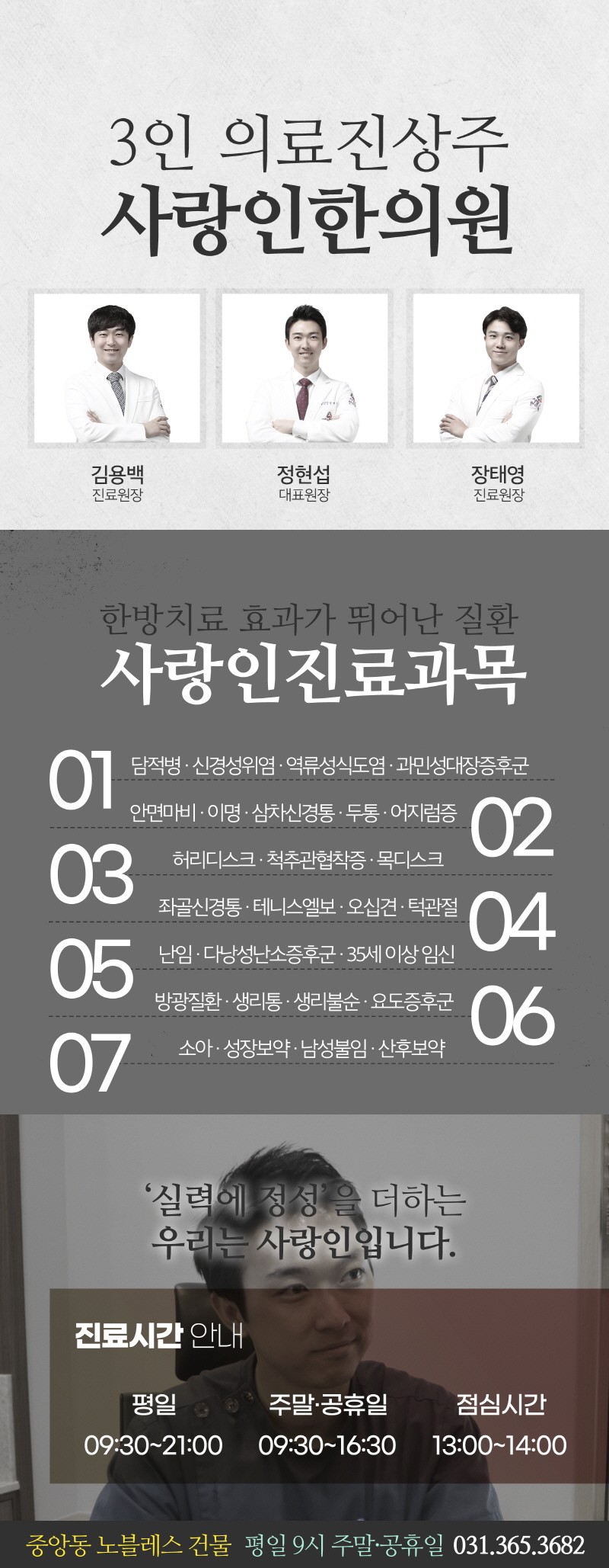 안산사랑인한의원에서는 바쁜 스케줄 때문에 필요한 때 제대로 치료받지 못하는 분들을 위해 평일 매일 밤 9시까지 야간진료를 하며 공휴일 진료, 일요일 진료를 하고 있습니다. 편한 시간대에 내원하셔서 자신의 건강상태를 살펴보시길바랍니다. 감사합니다.