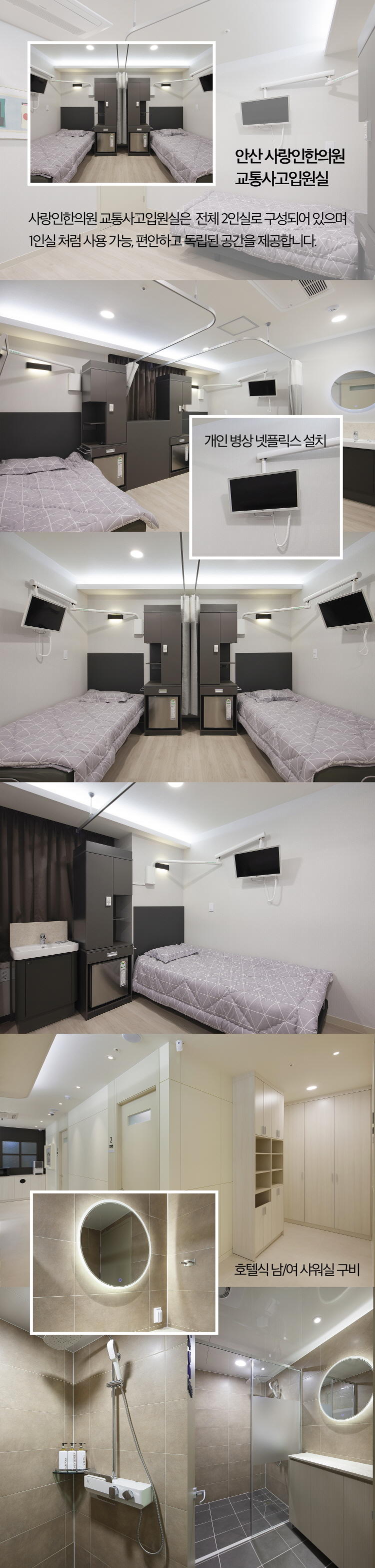 교통사고 입원치료의 경우 대기없이 입원이 가능합니다. 전 객실 2인실 입원실로 구성되어있으며 개별 병상마다 넷플릭스 설치가 되어있어 지루함없이 보낼 수 있습니다. 매 끼니마다 건강한 식사를 제공하고있으며, 기본적인 신체적 건강이 저하되지 않도록합니다. 본원에 내원하신다면 처리하기 힘든 부분까지 모든 부분을 도와드리고있습니다.