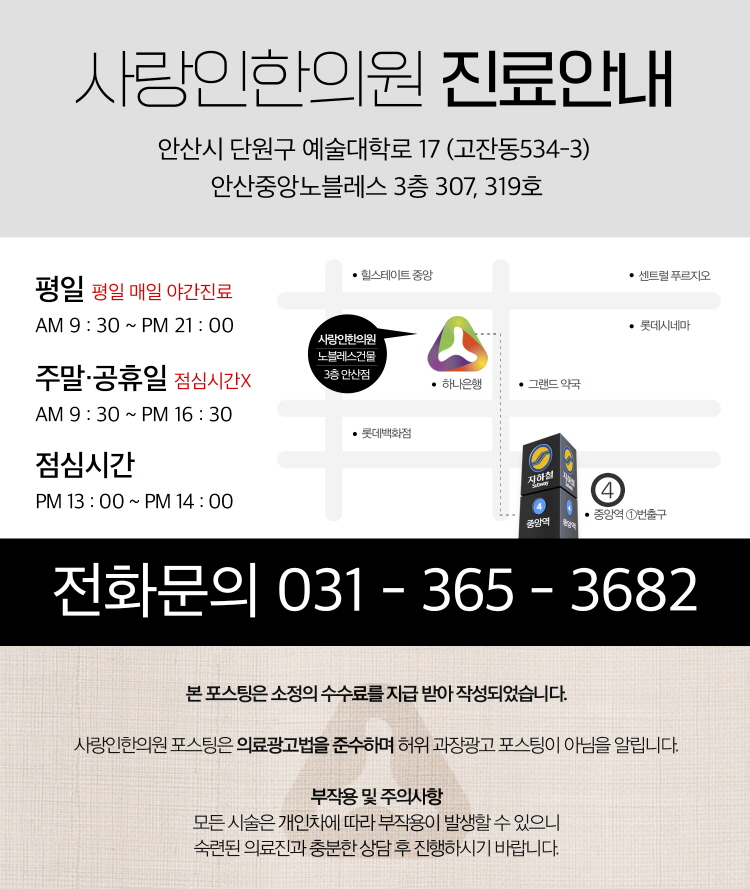 건강이 좋지 않을 때 마음놓고 언제든 내원하여 진단받을 수 있는 의료기관을 있다면 마음이 든든할거라 생각합니다. 환자분에게 버팀목이 되어드리고 정성스러운 진단과 치료가 가능한 안산중앙동한의원을 소개합니다. 어떠한 질환이든 올바른 진단과 치료가 가능합니다. 편안하고 여유롭게 내원할 수 있도록 매일 문을 열어두고있습니다. 매일 평일 야간진료와 주말, 공휴일에도 진료가 가능하오니 바쁜 분이라해도 편안하게 내원할 수 있습니다.