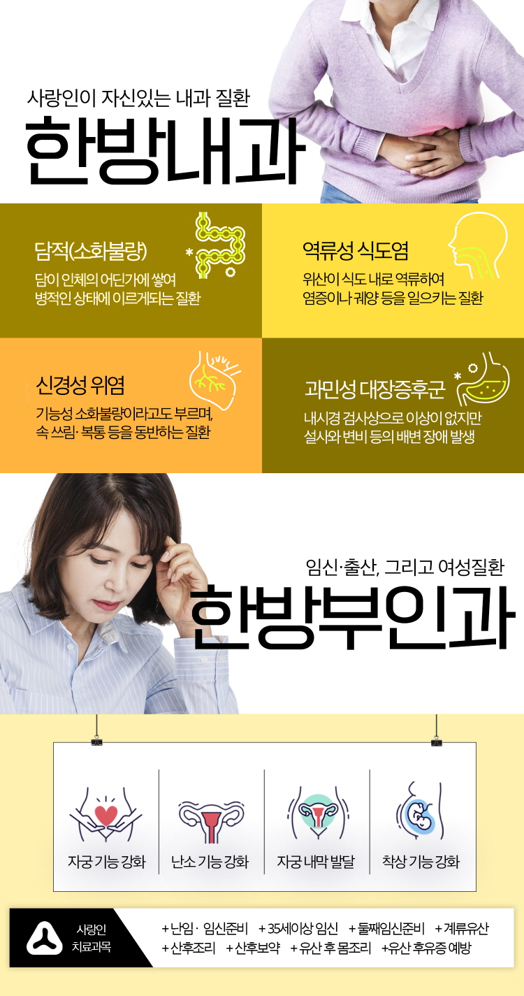 교통사고 후유증 치료만이 아닌 한방내과, 임신과 출산 등 여성질환에 대한 치료도 가능합니다. 현대인에게 가장 자주 나타나는 소화불량, 담적, 위염, 역류성식도염의 경우 병증을 방치하면 점점 병적인 상태에 이르게 되고 만성적인 질환으로 자리잡습니다. 초기에 올바른 치료를 통해 완화해야만 재발방지가 가능합니다. 임신, 출산, 난임, 여성질환 등으로 고민되는 경우에도 본원을 내원바랍니다.