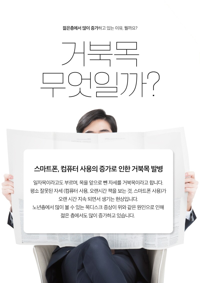 목디스크와 비슷한 척추질환의 경우 대부분 노화로 인한 퇴행성 변화가 주요 원인이 되는 경우가 많았습니다. 하지만, 현대에 들어서 잘못된 자세가 습관화되어 젊은 연령층에서도 목 통증을 호소하는 분이 늘어났습니다. 스마트폰을 오래 사용하게되면 스스로도 모르게 목이 쭉 앞으로 나오고 고개는 아래로 향하게 되는 자세를 취합니다.