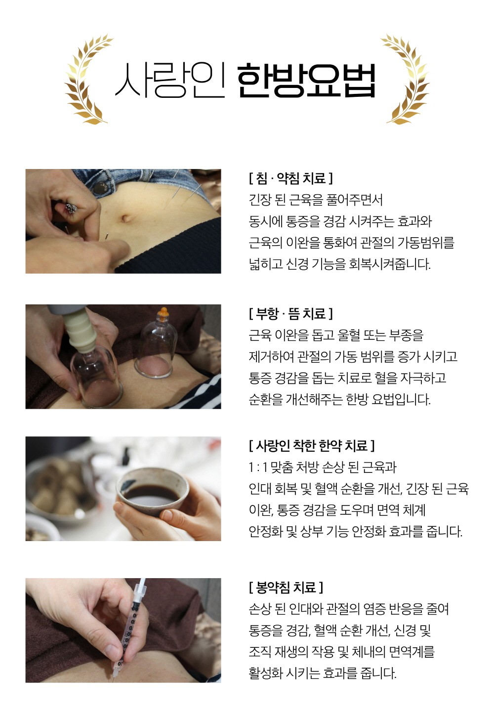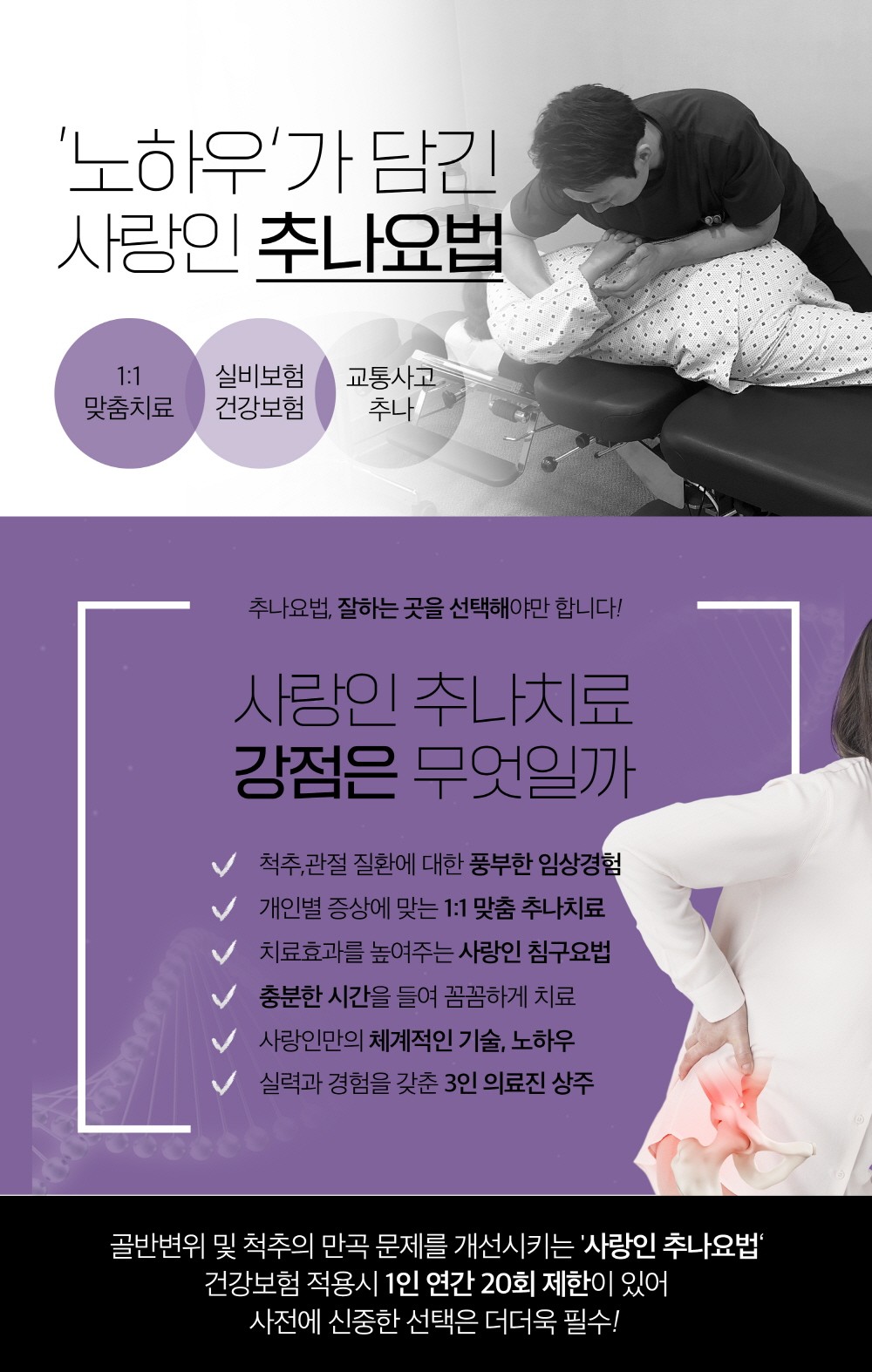 노하우가 담긴 본원의 한방치료를 통해 통증을 개선하고 틀어진 근골격계를 바로잡으시길 바랍니다. 추나요법은 건강보험 적용이 가능하고 1인 연간 20회 제한이 있어 사전에 신중하게 선택하여주시길 바랍니다.