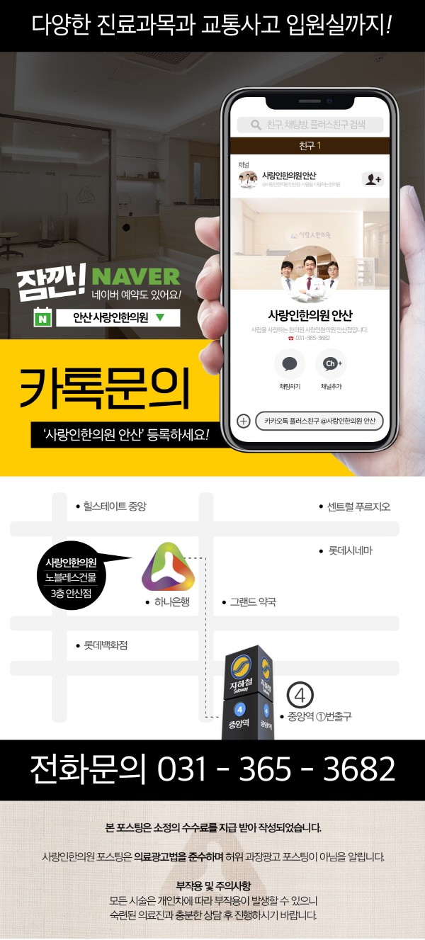 통증이 지속되어 힘드시다면 365일 쉬지 않고 진료가 가능한 안산목디스크 한의원에 내원하여 꼼꼼한 진단과 정확한 한방치료 시작해보시길 바랍니다. 감사합니다.