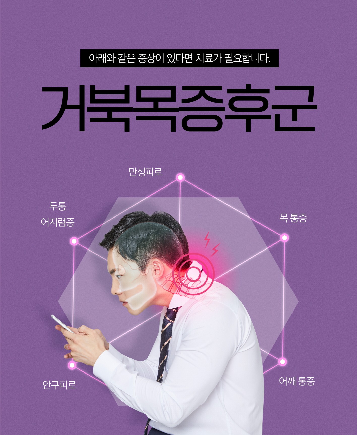 스마트폰을 사용할 때 고개가 아래로 향하면 그만큼 하중이 증가합니다. 지나치게 고개가 앞으로 나오면 신체 불균형으로 이어지며, 비대칭이 올 수 있으니 대칭을 맞추는 치료가 필요합니다. C자 모양이 변형되면서 머리가 앞으로 나오고 어깨와 등이 경직되기도합니다.